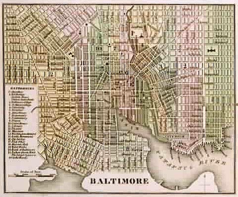 Detail of Baltimore from A new map of Maryland and Delaware with their canals, roads, & distances, by Henry Schenk Tanner, Philadelphia, 1833 [1836] (Map Collection, Maryland State Archives, MSA SC 1427-1-108).